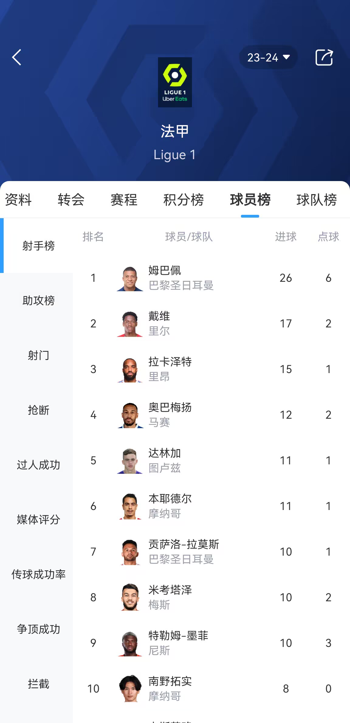 自2018-19賽季以來,姆巴佩已經連續五個賽季贏得了法甲金靴獎,本賽季他有很大的機會連續六年贏得這一榮譽。姆巴佩本賽季進了26個球,領先第二個9個球。